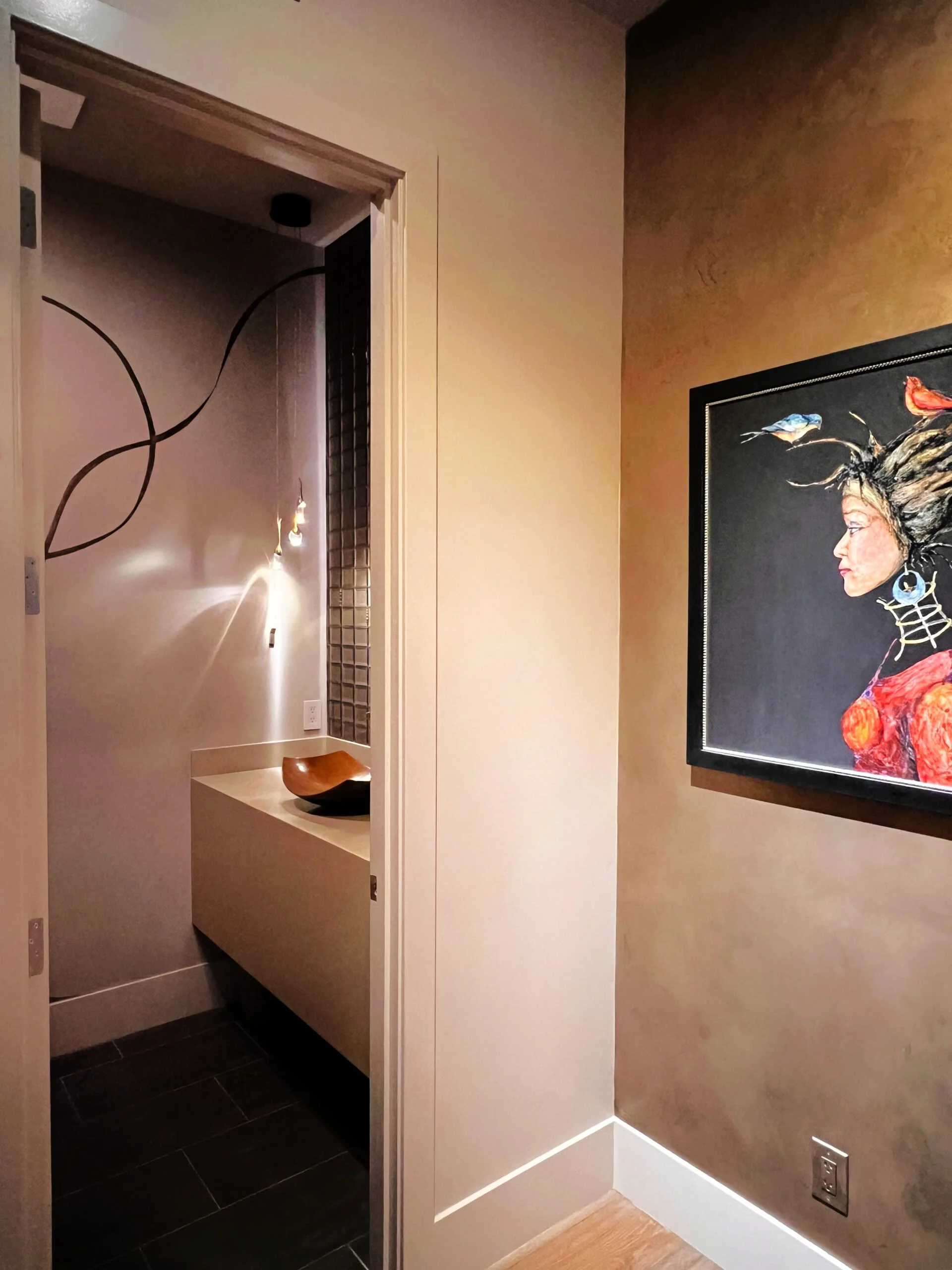 A contemporary powder bath features a unique plaster and metallic finish from artist Tracy Browner.