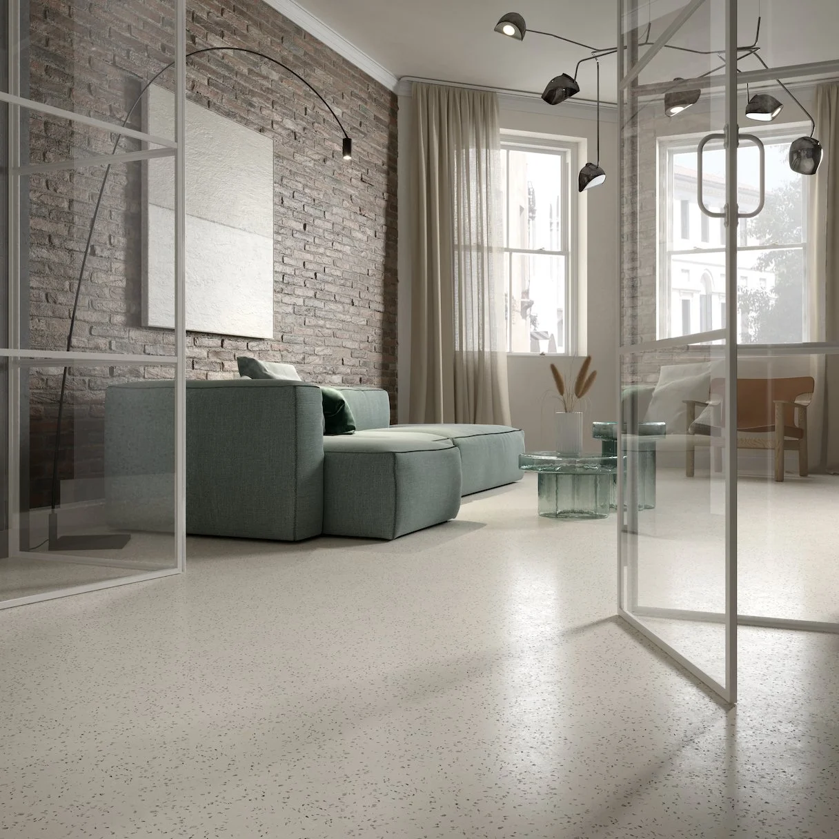 A seamless mineral system enriched with authentic Murano glass crystals and Carrara marble, bringing a modern take on the timeless Venetian terrazzo tradition.