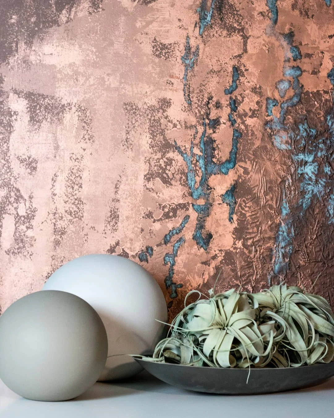 Verderame Wall Painting is a water-based decorative coating that replicates the effect of a copper surface exposed to atmospheric agents’ natural corrosion. The verdigris effects are suitable for interior and exterior projects. Surfaces decorated with Verderame Wall Painting are dynamic and the aesthetic can change over time.